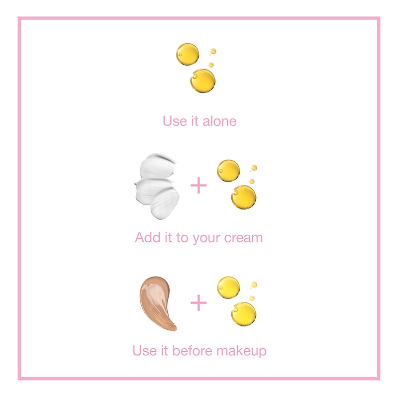 Για να δώσετε άμεση λάμψη, προσθέστε 1 ή 2 σταγόνες Oils in One στη κρέμα με χρώμα ή στο μέικάπ σας.